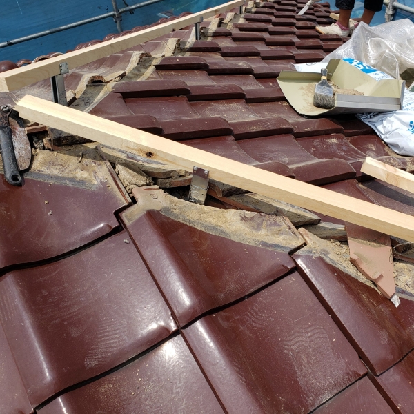 棟瓦を全て剥がし、台面の土を解体撤去して、屋根に専用の金具をステンレスビスで固定します。
